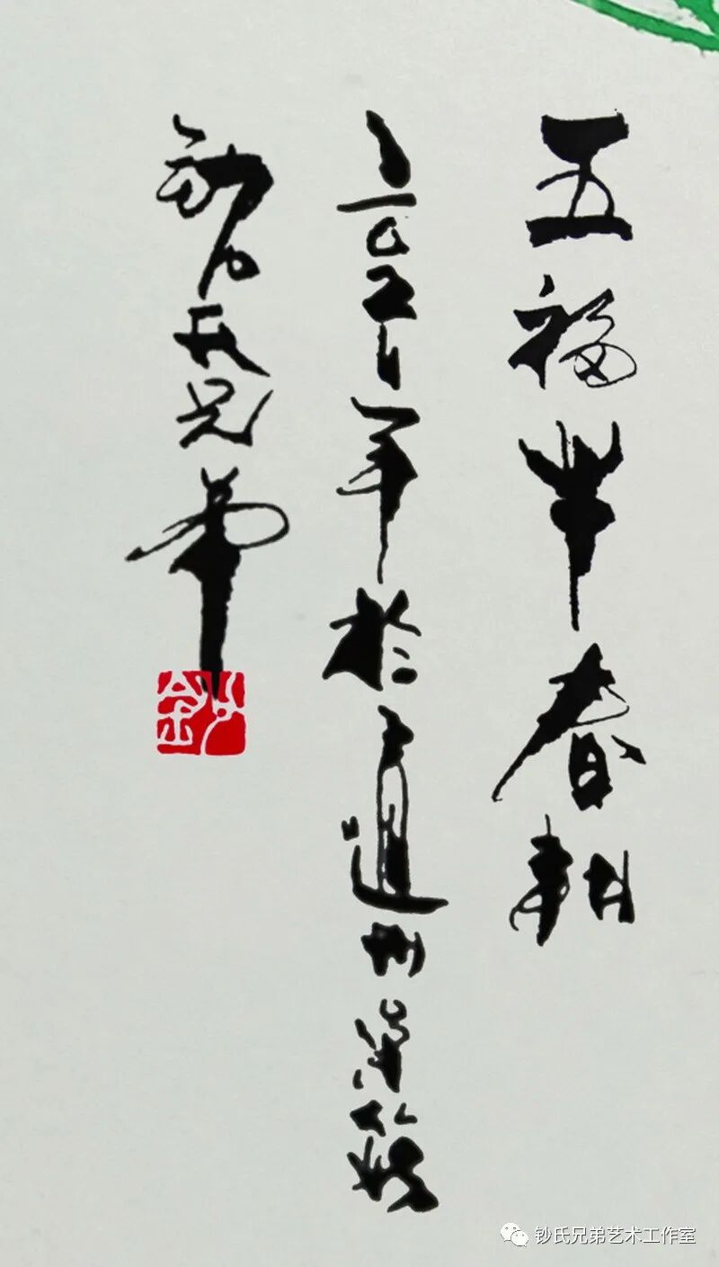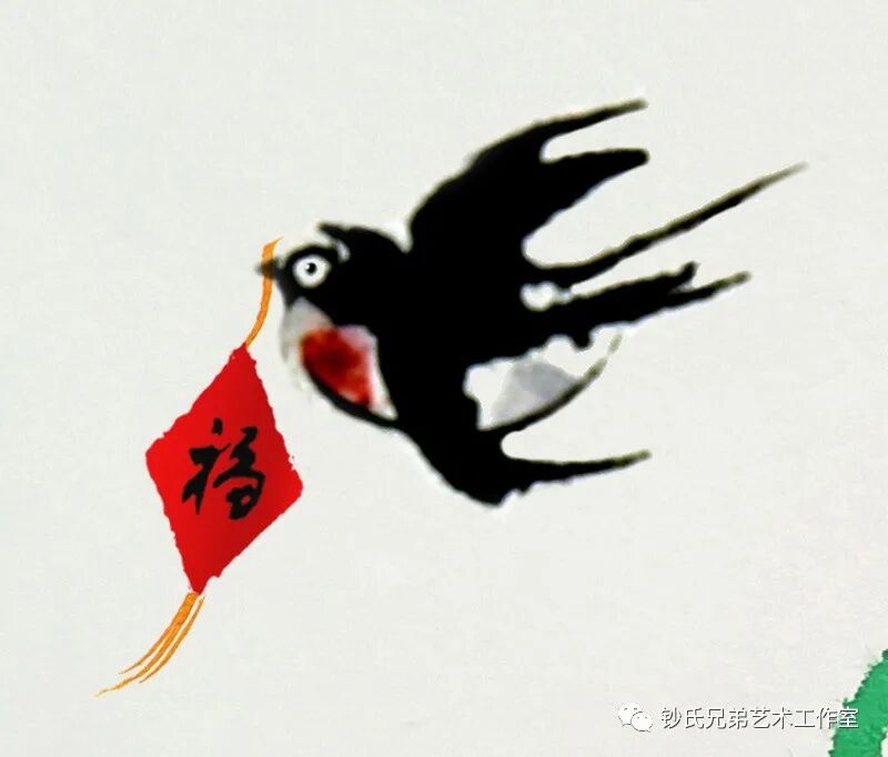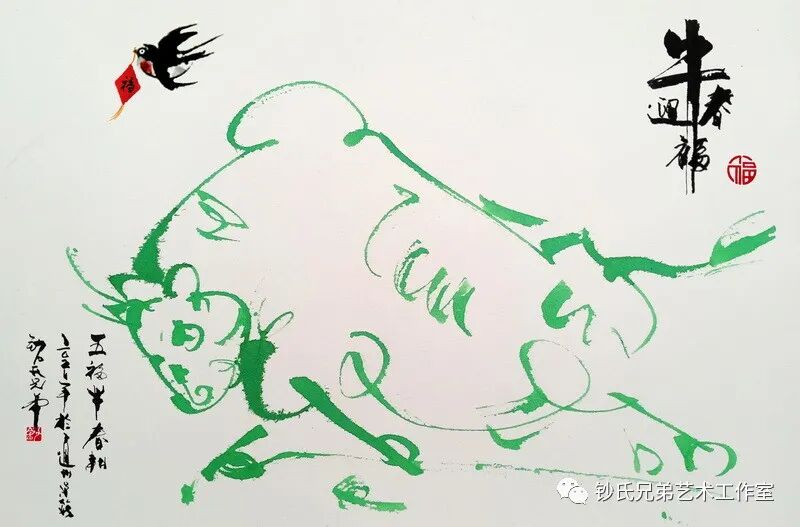 绿色线条牛寓春天 一只“燕子”衔“福”字与一个拦边章“福”呼应