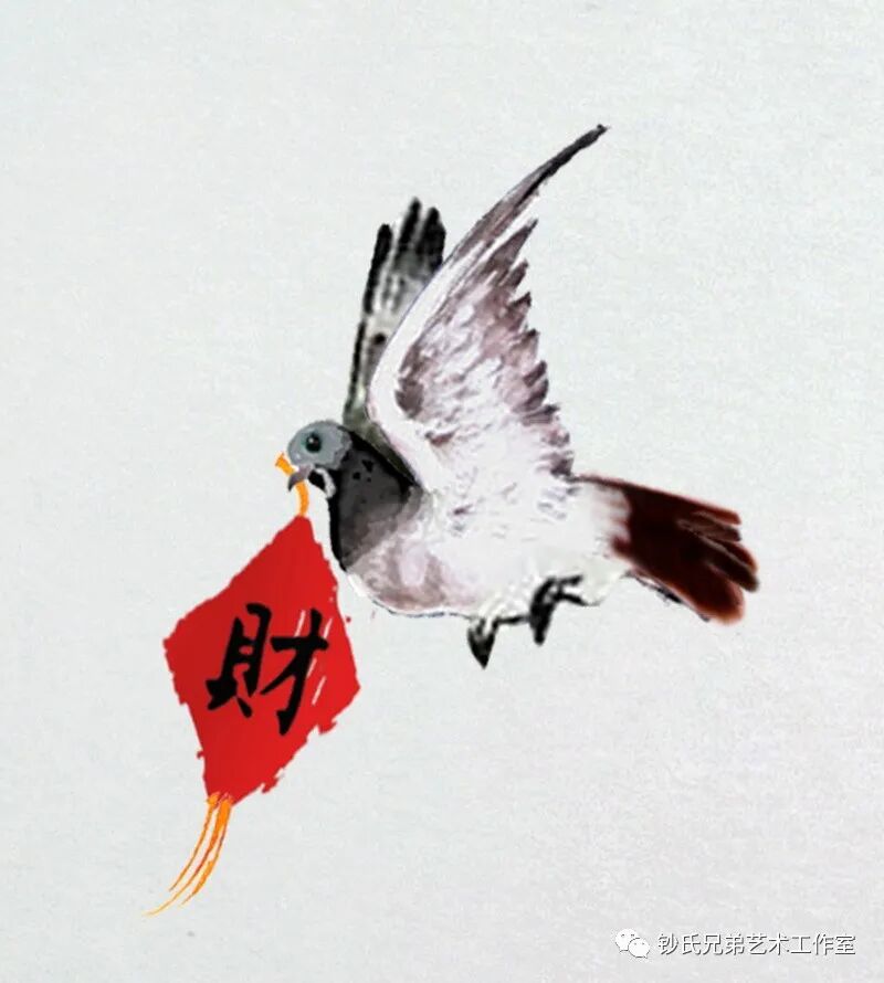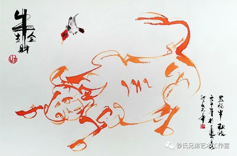 金色线条牛寓秋天 一只“鸽子”衔“财”字与一个拦边章“财”呼应