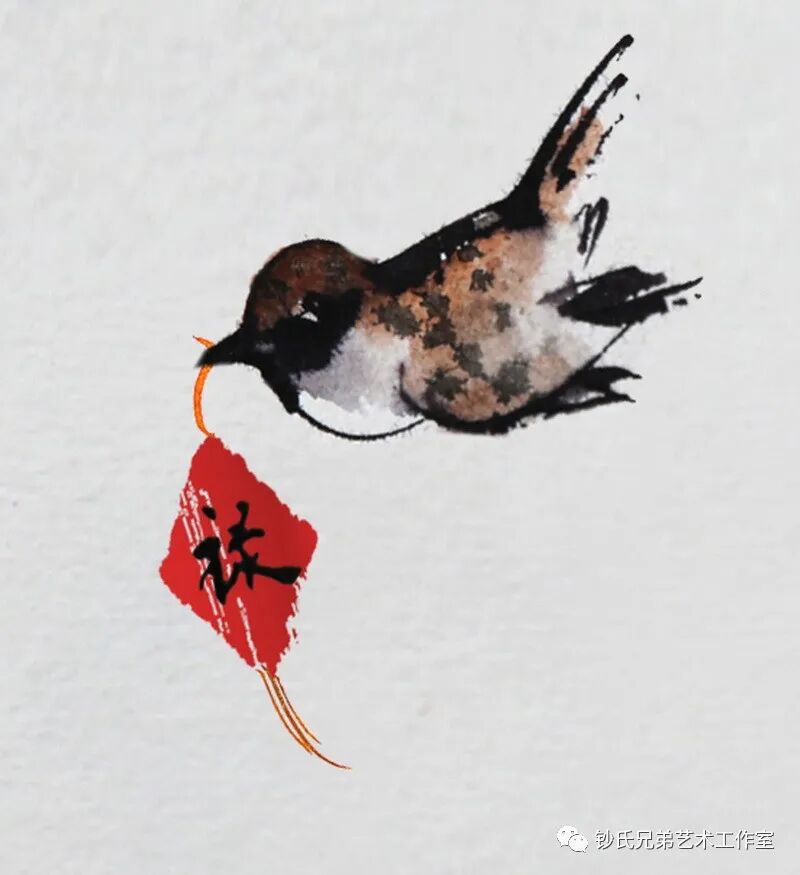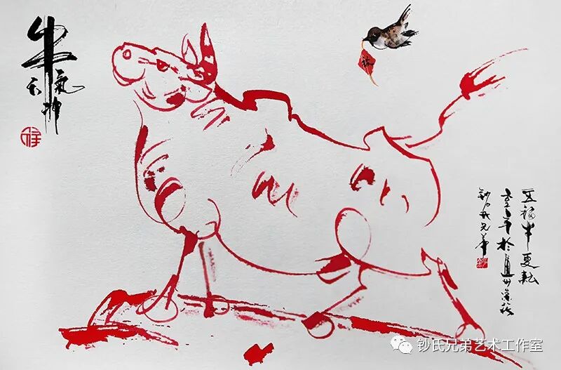 红色线条牛寓夏天 一只“麻雀”衔“禄”字与一个拦边章“禄”呼应