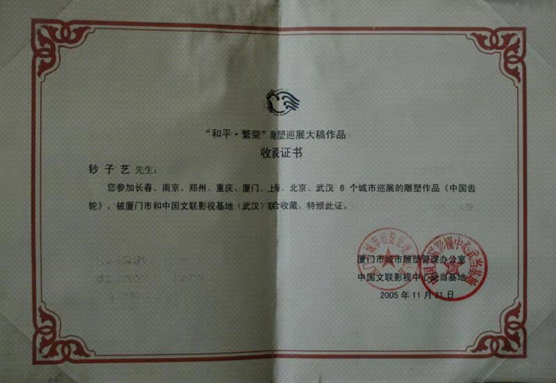 钞氏兄弟作品《中国齿轮》2005年参加抗战六十周年美展,后被南京市政府与厦门市政府收藏;